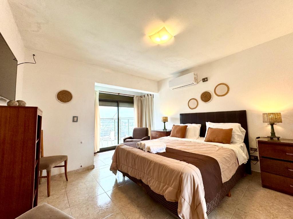 "Desayuno correcto con rica panera, dulce, manteca, crema, jamón y queso. Jugo de naranja recién exprimido. Infusiones, cereales, yogurt y fruta en conserva (duraznos). Nos dieron una suite familiar con dos habitaciones, estuvimos muy cómodos. Dos televisores. Refrigerador y pava eléctrica. Espacio para guardar y colgar ropa. Caja de seguridad. Baño pequeño sin superficies de apoyo, pero con vanitory. Hay piscina y espacio para tomar sol. El estacionamiento es en un terreno ubicado enfrente, es abierto pero tiene cámaras de seguridad. Los propietarios viven en el establecimiento y son muy amables. El establecimiento es lo que en Europa se llamaría un Bed and Breakfast ubicado en las afueras de la ciudad en un lugar tranquilo y elevado que permite tener excelentes vistas de las montañas y del lago. En la planta principal se encuentra el sector de desayuno con lindos muebles y decoración. Las habitaciones están arriba o abajo."