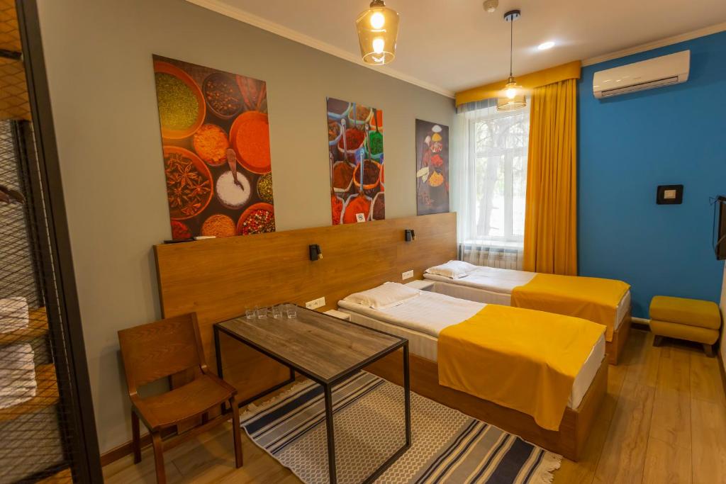 "Really lovely clean and modern hotel/hostel. Lovely outside are with so many different tents and shelters to sit in! Really friendly and helpful staff! Also a wonderful Moroccan restaurant/bar called Riad situated beneath the hotel! Very close to Osh Bazaar!"
